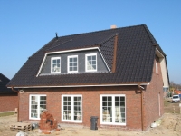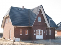 Die nach oben offene Diele im Eingangsbereich und die innen- liegende Geschosstreppe verleihen diesem Haus seine per- sönliche Note. Besonders ansprechend wirkt die symmetrische Vorderansicht mit dem Friesengiebelund den verzierten Holz- elementen. Die Küche kann auf Wunsch zum ohnehin schon großzügigen Wohnzimmer geöffnet werden.